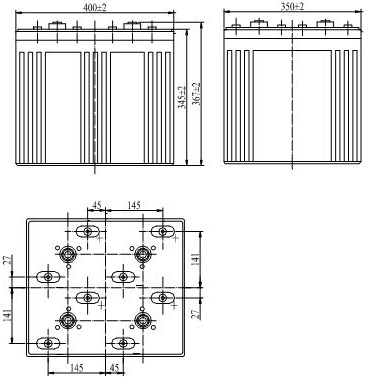 | *Specifications | | | | Terminal Type: B5 Terminal Material: Copper | | Nominal Voltage | 2V | | Rated Capacity | 1500Ah | | Dimensions ± 2mm | Length | 398mm | | Width | 350mm | | Height | 341mm | | Total Height | 381mm | | Approximate Weight | 102Kg | Capacity 77°F (25 °C) | 10h rate (150A,1.80V) | 1500Ah | | 5h rate (270A,1.75V) | 1350Ah | | 1h rate (930A,1.60V) | 930Ah | | Internal Resistance | Full charged Battery | 0.13mΩ | | 77oF (25 oC) | | Capacity affected by temperature (20h rate) | 104OF (40oC) | 102% | | 77 oF (25oC) | 100% | | 32 oF (0oC) | 85% | | 5 oF (-15oC) | 65% | | Self-Discharge 68oF (20oC) (Capacity after) | 3 month storage | 91% | | 6 month storage | 82% | | 12 month storage | 65% | | Max. Discharge Current 77°F (25°C) | 4000A (5s) | | Max.Charging Current 77°F (25°C) | 300A | | Terminal Type & Material | B5 Copper | Charge (Constant Voltage, 25°C) | Cycle | 2.35-2.40V (-5mV/°C) | | max. current:300A | | Float | 2.25-2.30V (-3.3mV/°C) | | Nominal Operating Temperature | 25°C±3°C (77°F±5) | | Operating Temperature Range | -15C~+45C (5°F~122°F) | |