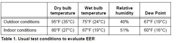 The EER is usually specified under the conditions shown in table 1. The SEER is averaged over a range of temperatures that are less than or equal to this,