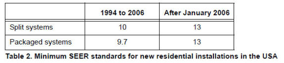 In the US, the DoE specifies the minimum values for SEER as shown in table 2. The law was changed in January 2006 and the table lists the old and new