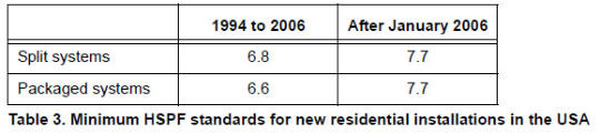 In the US, the DoE specifies the minimum values for HSPF as shown in table 3. The law was changed in January 2006 and the table lists the old and new