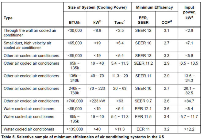 The following tables list the minimum performance standards that must be met for new installations of air conditioning systems in the US as of the date of this