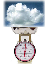 We're only going to look at the weight of the actual cloud particles, and realize different clouds have varying densities of cloud particles (and, thus, different weights). Let's use your basic "everyday" cloud—the cumulus cloud with a volume of about 1 cubic kilometer (km) (0.62 miles) located about 2 km (1.2 miles) above the ground. In other words, it is a cube about 1 km (0.24 cubic miiles) on each side. One measurement (http://snowball.millersville.edu/~adecaria/ESCI340/esci340_cp_lesson01_cloud_properties.pdf) of cumulus-cloud density is about 0.5 gram per cubic meter. A 1 km3 cloud contains 1 billion cubic meters. Doing the math: 1,000,000,000 x 0.5 = 500,000,000 grams of water droplets in our cloud. That is about 500,000 kilograms or 1.1 million pounds (about 551 tons). But, that "heavy" cloud is floating over your head because the air below it is even heavier— the lesser density of the cloud allows it to float on the dryer and more-dense air. Global distribution of atmospheric water One estimate of global water distribution | Water source | Water volume, in cubic miles | Water volume, in cubic kilometers | Percent of total freshwater | Percent of total water | | Atmosphere | 3,094 | 12,900 | 0.04% | 0.001% | | Total global fresh water | 8,404,000 | 35,030,000 | 100% | 2.5% | | Total global water | 332,500,000 | 1,386,000,000 | -- | 100% | | Source: Gleick, P. H., 1996: Water resources. In Encyclopedia of Climate and Weather, ed. by S. H. Schneider, Oxford University Press, New York, vol. 2, pp.817-823. | |