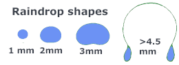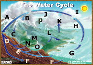 | Precipitation: The Water Cycle Precipitation is water released from clouds in the form of rain, freezing rain, sleet, snow, or hail. It is the primary connection in the water cycle that provides for the delivery of atmospheric water to the Earth. Most precipitation falls as rain. How do raindrops form? The clouds floating overhead contain water vapor and cloud droplets, which are small drops of condensed water. These droplets are way too small to fall as precipitation, but they are large enough to form visible clouds. Water is continually evaporating and condensing in the sky. If you look closely at a cloud you can see some parts disappearing (evaporating) while other parts are growing (condensation). Most of the condensed water in clouds does not fall as precipitation because their fall speed is not large enough to overcome updrafts which support the clouds. For precipitation to happen, first tiny water droplets must condense on even tinier dust, salt, or smoke particles, which act as a nucleus. Water droplets may grow as a result of additional condensation of water vapor when the particles collide. If enough collisions occur to produce a droplet with a fall velocity which exceeds the cloud updraft speed, then it will fall out of the cloud as precipitation. This is not a trivial task since millions of cloud droplets are required to produce a single raindrop. A more efficient mechanism (known as the Bergeron-Findeisen process) for producing a precipitation-sized drop is through a process which leads to the rapid growth of ice crystals at the expense of the water vapor present in a cloud. These crystals may fall as snow, or melt and fall as rain. Care to guess how many gallons of water fall when 1 inch (2.5 cm) of rain falls on 1 acre of land? What do raindrops look like?Let me introduce myself - I am Drippy, the (un) official USGS water-science icon. It is obvious that I am a raindrop, right? After all, all of you know that raindrops are shaped, well ... like me. As proof, you've probably seen me on television, in magazines, and in artists' representations. Truth is, I am "Drippy" and actually I am shaped more like a drip falling from a water faucet than a raindrop. The common raindrop is actually shaped more like a hamburger bun. As Alistair Frasier explains in his web page, Bad Rain, small raindrops, those with a radius of less than 1 millimeter (mm), are spherical, like a round ball. As droplets collide and grow in size, the bottom of the drop begins to be affected by the resistance of the air it is falling through. The bottom of the drop starts to flatten out until at about 2-3 mm in diameter the bottom is quite flat with an indention in the middle - much like a hamburger bun. Raindrops don't stop growing at 3 millimeters, though, and when they reach about 4-5 mm, things really fall apart. At this size, the indentation in the bottom greatly expands forming something like a parachute. The parachute doesn't last long, though, and the large drop breaks up into smaller drops. Precipitation rates vary geographically and over time Precipitation does not fall in the same amounts throughout the world, in a country, or even in a city. Here in Georgia, USA, it rains fairly evenly all during the year, around 40-50 inches (102-127 centimeters (cm)) per year. Summer thunderstorms may deliver an inch or more of rain on one suburb while leaving another area dry a few miles away. But, the rain amount that Georgia gets in one month is often more than Las Vegas, Nevada observes all year. The world's record for average-annual rainfall belongs to Mt. Waialeale, Hawaii, where it averages about 450 inches (1,140 cm) per year. A remarkable 642 inches (1,630 cm) was reported there during one twelve-month period (that's almost 2 inches (5 cm) every day!). Is this the world record for the most rain in a year? No, that was recorded at Cherrapunji, India, where it rained 905 inches (2,300 cm) in 1861. Contrast those excessive precipitation amounts to Arica, Chile, where no rain fell for 14 years, and in Bagdad, California, where precipitation was absent for 767 consecutive days from October 1912 to November 1914. The map below shows average annual precipitation, in millimeters and inches, for the world. The light green areas can be considered "deserts". You might expect the Sahara area in Africa to be a desert, but did you think that much of Greenland and Antarctica are deserts? On average, the 48 continental United States receives enough precipitation in one year to cover the land to a depth of 30 inches (0.76 meters). Precipitation size and speed Have you ever watched a raindrop hit the ground during a large rainstorm and wondered how big the drop is and how fast it is falling? Or maybe you've wondered how small fog particles are and how they manage to float in the air. The table below shows the size, velocity of fall, and the density of particles (number of drops per square foot/square meter of air) for various types of precipitation, from fog to a cloudburst. | | | Intensity inches/hour (cm/hour) | Median diameter (millimeters) | Velocity of fall feet/second (meters/second) | Drops per second per square foot (square meter) | | Fog | 0.005 (0.013) | 0.01 | 0.01 (0.003) | 6,264,000 (67,425,000) | | Mist | .002 (0.005) | .1 | .7 (.21) | 2,510 (27,000) | | Drizzle | .01 (0.025) | .96 | 13.5 (4.1) | 14 (151) | | Light rain | .04 (0.10) | 1.24 | 15.7 (4.8) | 26 (280) | | Moderate rain | .15 (0.38) | 1.60 | 18.7 (5.7) | 46 (495) | | Heavy rain | .60 (1.52) | 2.05 | 22.0 (6.7) | 46 (495) | | Excessive rain | 1.60 (4.06) | 2.40 | 24.0 (7.3) | 76 (818) | | Cloudburst | 4.00 (10.2) | 2.85 | 25.9 (7.9) | 113 (1,220) | | Source: Lull, H.W., 1959, Soil Compaction on Forest and Range Lands, U.S. Dept. of Agriculture, Forestry Service, Misc. Publication No.768 | | | Sources and more information Choose a water-cycle topic  | A - Storage in ice and snow B - Precipitation C - Snowmelt runoff to streams D - Infiltration E - 