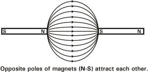 A magnet is labeled with North (N) and South (S) poles. The magnetic force in a magnet flows from the North pole to the South pole. This creates a